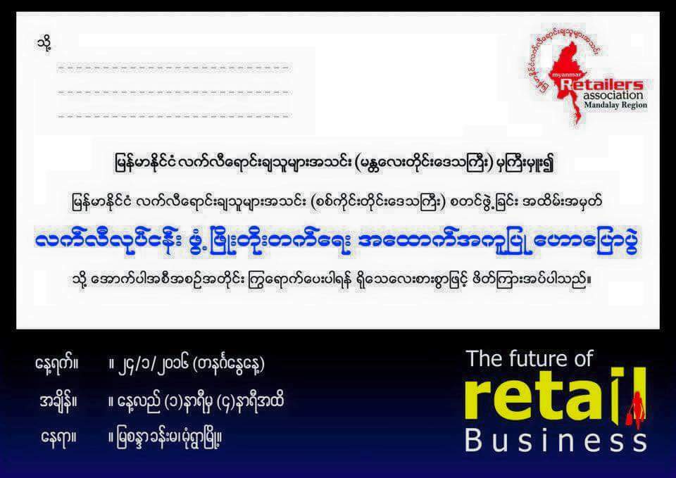 ျမန္မာႏိုင္ငံလက္လီေရာင္းခ်သူမ်ားအသင္း၊ စစ္ကိုင္းတိုင္းေဒသႀကီး အသင္းခြဲတည္ေထာင္းျခင္းႏွင့္ အသင္းခြဲ၏ အလုပ္အမႈေဆာင္ ေရြးခ်ယ္ပြဲကို ယေန႔ ၂၀၁၆ခုႏွစ္၊ ဇႏၷဝါရီလ၊ (၉)ရက္ေန႔မွာ မံုရြာၿမိဳ႕၊ ဟိုတယ္ခ်င္းတြင္း၌ က်င္းပခဲ့ပါတယ္။