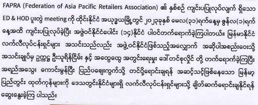၂၀၂၃ ခုနှစ်၊ မေလတွင် ASEAN Business Advisory Council Chairman မှ မြန်မာနိုင်ငံသို့ လာရောက်လည်ပတ်သည့် ခရီးစဉ်တွင် လုပ်ငန်းဆိုင်ရာ အဖွဲ့အစည်းများနှင့် တွေ့ဆုံသည့် အစည်းအဝေးသို့ မြန်မာနိုင်ငံလက်လီရောင်းချသူများအသင်း၏ ဗဟိုအလုပ်အမှုဆောင် ဦးနေလင်းဖြိုးမှ တက်ရောက်ဆွေးနွေးခဲ့ပါသည်။
