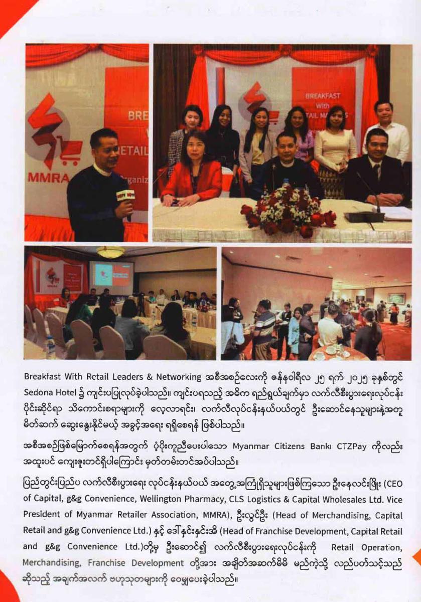 “MEET & GREET With RETAIL LEADERS” ဆွေးနွေးပွဲကို (30.08.2025) နေ့တွင် နေ့လည် (3:00) မှ ညနေ (5:00) ထိ ရန်ကုန်မြို့ UAB Tower @ Time City တွင် ကျင်းပပြုလုပ်ရာ လက်လီလုပ်ငန်း နယ်ပယ်တွင် အဓိကဦးဆောင် နေသူများ ဖြစ်သည့် ဦးနေလင်းဖြိုး (CEO of Capital Retail and g&g Convenience Co., Ltd , Vice President of Myanmar Retailer Association, MMRA) နှင့် ဦးဖြိုးမင်းကျော် (CEO of City Mart Holding Co., Ltd.) တို့မှ လက်လီလုပ်ငန်းနယ်ပယ် နှင့်ပတ်သက်သည့် အသိပညာများကို “ How to Ensure Long-Term Success for Your Retail Store” ခေါင်းစဉ်ဖြင့် ဆွေးနွေးခဲ့ကြပါသည်။