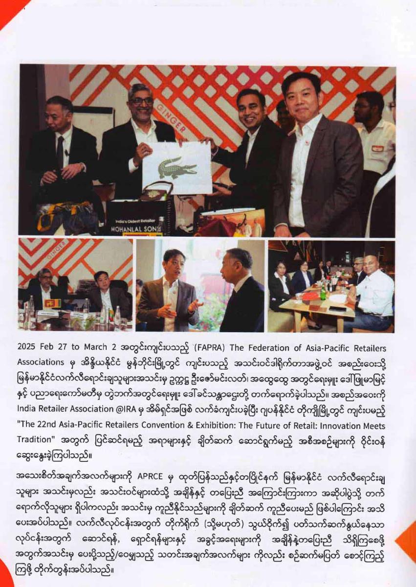 2025 July 10th & 11th တွင် မလေးရှားနိုင်ငံတွင် ကျင်းပသော Federation of Asia-Pacific Retailers Associations (FAPRA) ၏ အစည်းအဝေးသို့ Myanmar Retailers Association ဥက္ကဌ ဦးဇော်မင်းလတ် တက်ရောက်၍ ဆွေးနွေးခဲ့ကြပါသည်။ ထိုအစည်းအဝေးတွင် အာရှ-ပစိဖိတ် ဒေသရှိ လက်လီစီးပွားရေး အသင်း များမှ ကိုယ်စားလှယ်များ တက်ရောက်ကာ ဒေသအလိုက် လက်လီဈေးကွက် အခြေအနေများ၊ စားသုံးသူအပြုအမူ ပြောင်းလဲမှုများနှင့် စက်မှုနည်းပညာ အသစ်များ ကို အမြင်ဖလှယ် ဆွေးနွေးခဲ့ကြပါသည်။