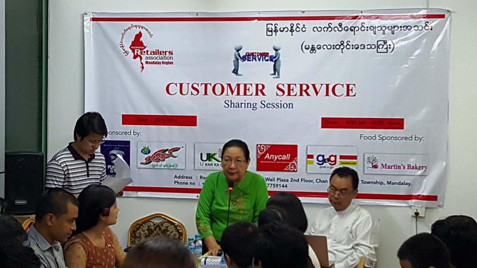 ျမန္မာနိုင္ငံလက္လီေရာင္းခ်သူမ်ားအသင္း(မႏၲေလးတိုင္းေဒသႀကီး)မွ ႀကီးမွဴးျပဳလုပ္ေသာ Customer Service (sharing session) ကို ၂၉-၅-၂၀၁၆ တြင္ မနက္ ၉ နာရီ မွ ေန႕လည္ ၁၂ ထိ အသင္းအစည္းေဝးခန္းမ ၌က်င္းပျပဳလုပ္ျပီး အသင္းဥကၠဌ မွ အဖြင့္အမွာစကားေျပာၾကား၍ ပညာေရးေကာ္မတီ ဒုဥကၠဌ မွ sharing session ျပဳလုပ္ရျခင္းအေၾကာင္းရွင္းလင္းေျပာၾကားကာ ဆရာဦးေကာင္းျငိမ္းစိုး(KUDOS Bussiness School ) မွ ဦးေဆာင္ ၍ တက္ေရာက္လာက်ေသာ ဧည့္သည္ေတာ္မ်ားနွင့္ အျပန္အလွန္ ေဆြးေႏြးက်သည္