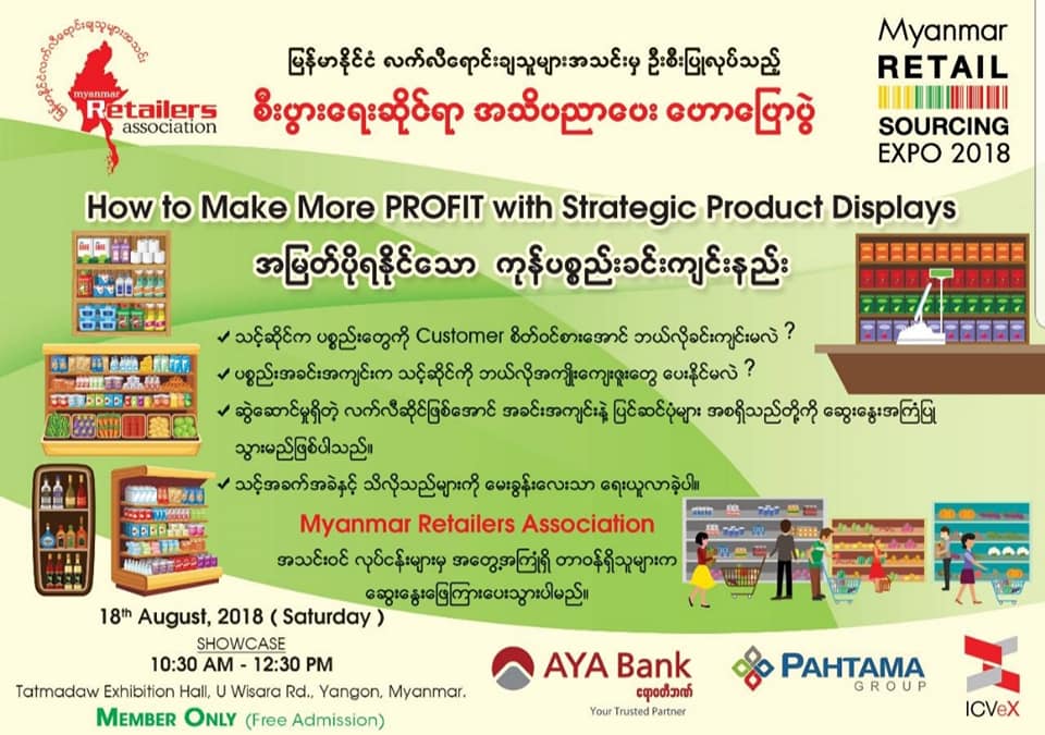 ICVeX Company က တပ္မေတာ္ခန္းမမွာက်င္းပတဲ့ Myanmar FoodBev & Retail Sourcing ျပပြဲကို အားျဖည့္ေပးတဲ့အေနနဲ႔ ျမန္မာႏိုင္ငံလက္လီေရာင္းခ် သူမ်ားအသင္းမွ ဗဟိုအလုပ္အမႈေဆာင္အဖြဲ႕က ... "အျမတ္ပိုရႏိုင္ေသာ ကုန္ပစၥည္းခင္းက်င္းနည္း" ေခါင္းစဥ္ျဖင့္ ဩဂုတ္လ၊ (၁၈) ရက္ေန႔နံနက္ပိုင္းက အဖြဲ႕လိုက္ေဆြးေႏြးေျဖၾကားေပးခဲ့ၾကပါတယ္ ...